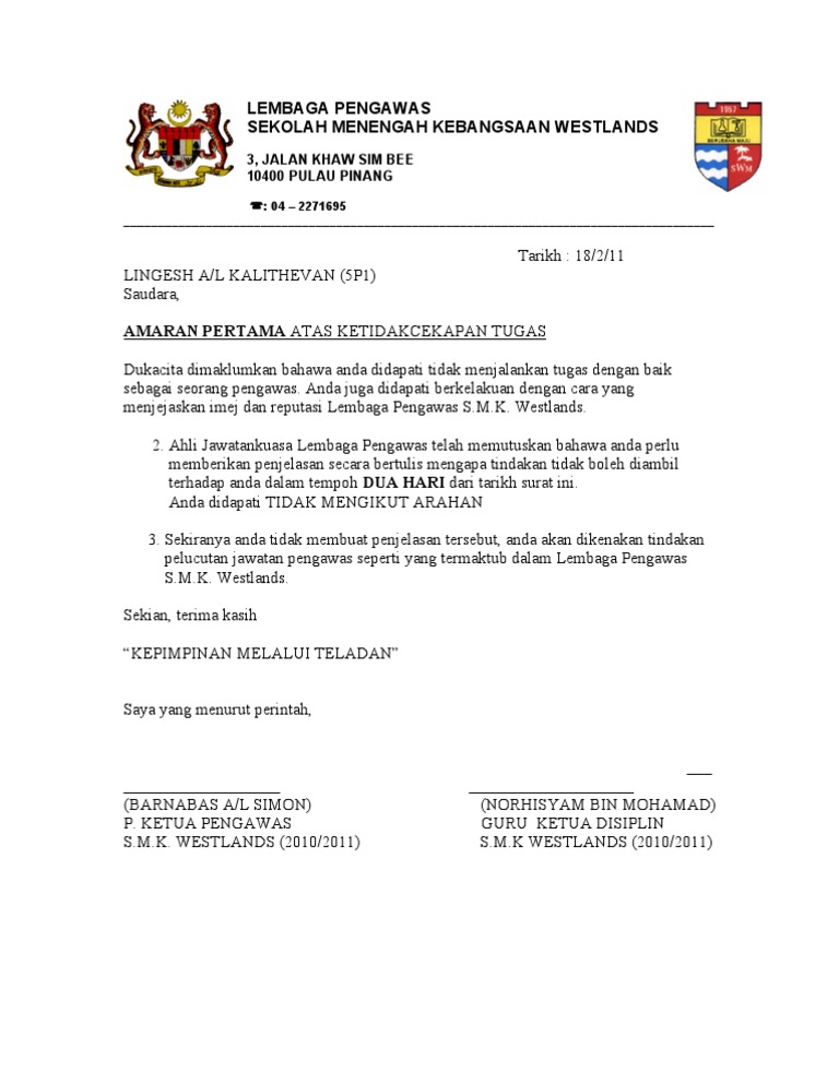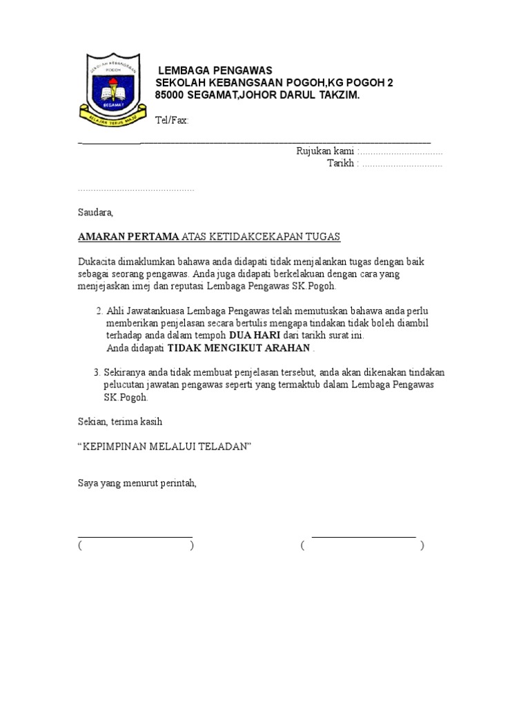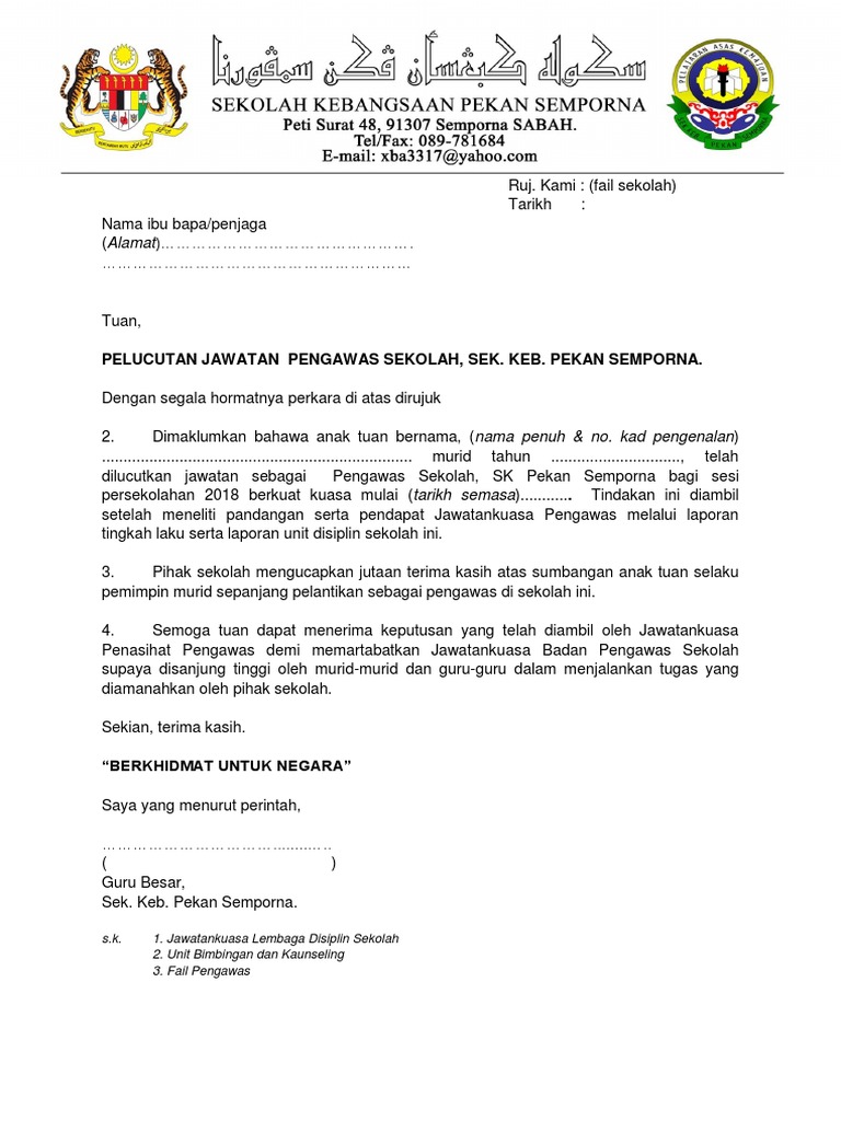 Contoh Surat Pelucutan Jawatan Pengawas Sekolah