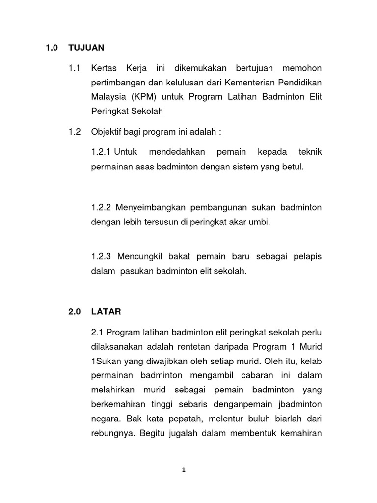 4 KERTAS KERJA PROGRAM ELIT OLAHRAGA SMK KELADI PENDAHULUAN. Contoh kertas kerja badminton 1. Bulu tangkis percuma untuk menjalani latihan badminton secara berterusan 40 Pembentukan Jawatankuasa dan tugas jawatankuasa 3.