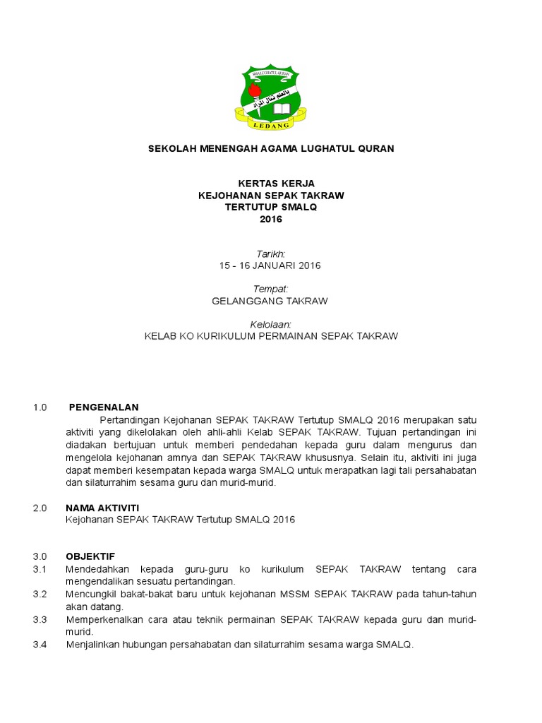 Contoh kertas kerja perkhemahan ssn smk seri kota. Perbelanjaan yang diperlukan Membuat perlantikan pengurus bagi setiap sukan yang dipertandingkan Merangka latihan bersama pengurus bagi. KERTAS KERJA PERTANDINGAN BADMINTON BEREGU TERTUTUP PERINGKAT IPG KAMPUS KENINGAU Anjuran PISMP Sejarah Ambilan Jun 2016 Semester Dua TARIKH.