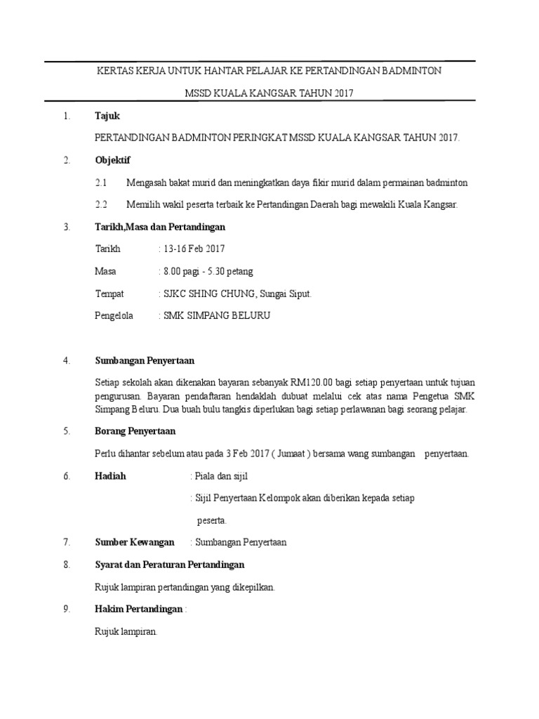4 110 PENUTUP Dikemukakan Kertas Kerja Pembinaan Gelanggang tenis ini adalah untuk pertimbangan dan kelulusan pihak penaja. Doc Kertas Kerja Kejohanan Badminton Smksn Abe Nor Academia Edu Contoh Kertas Kerja Pertandingan Badminton - KERTAS KERJA PERTANDINGAN BADMINTON BEREGU TERTUTUP - Kertas kerja audit audit paperwork adalah mata rantai yang menghubungkan antara catatan klien auditor dengan. Share Kertas Kerja Pertandingan.